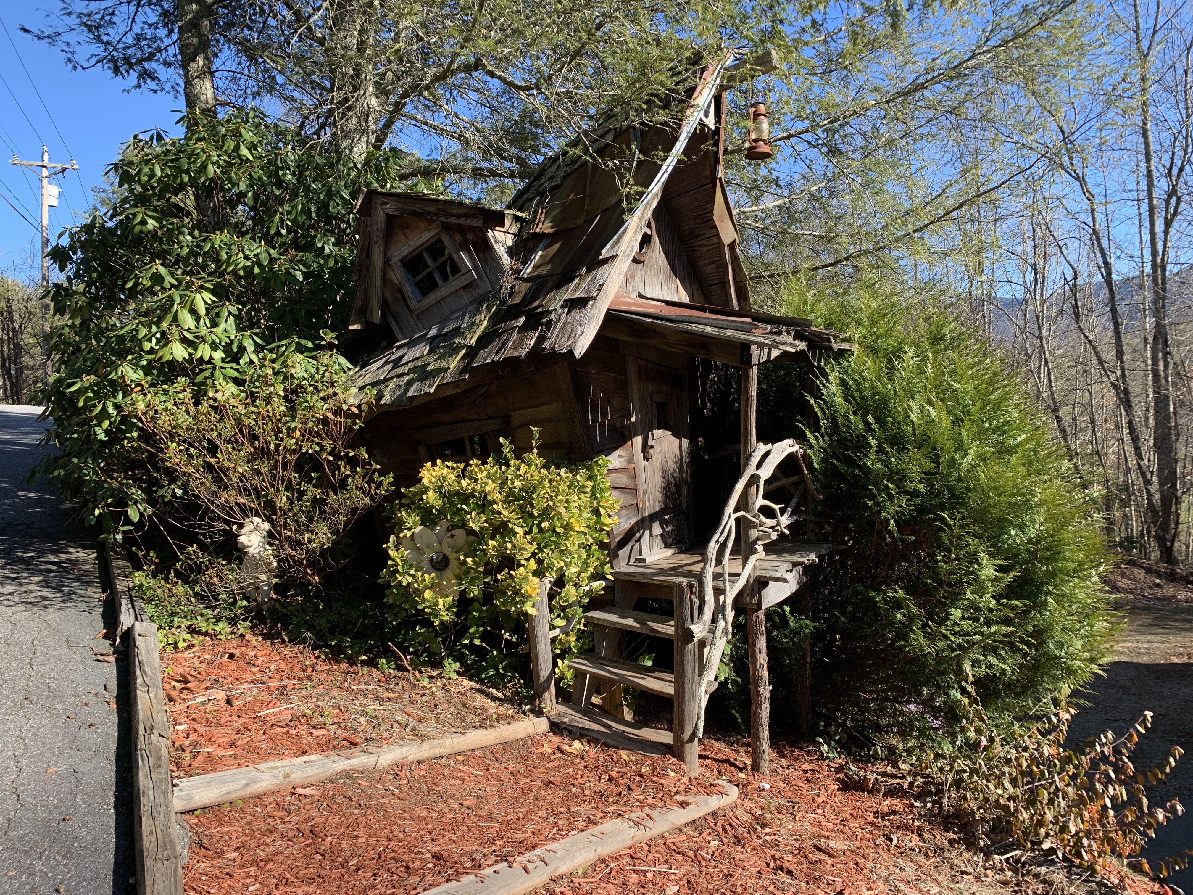 I remembered this place off the main road that we always passed by going to and from the cabin. I would always say “we have to stop there and check it out” every time we passed it. I’m glad we waited until now to finally visit because we wouldn’t have appreciated it as much as we did this day. The place is called Sleepy Hollow and the artist creates beautiful hand made whimsical fairy and hobbit style houses from small birdhouse size houses to large treehouse size playhouses.
