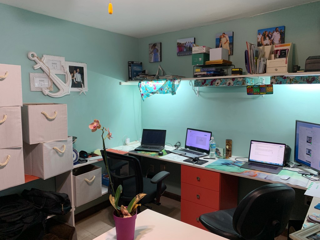 Since Rob has been working remotely for several months and probably will continue to work from home for a lot longer, my dad and brother built us a desk in our office/studio as my birthday present. It took them just a day to build it but it took me several days to sand, prime, paint and polyurethane it but it looks fantastic. We still haven’t finished getting rid of the old desks and bookshelves as well as moving everything into the new desk but here’s a sneak peak.