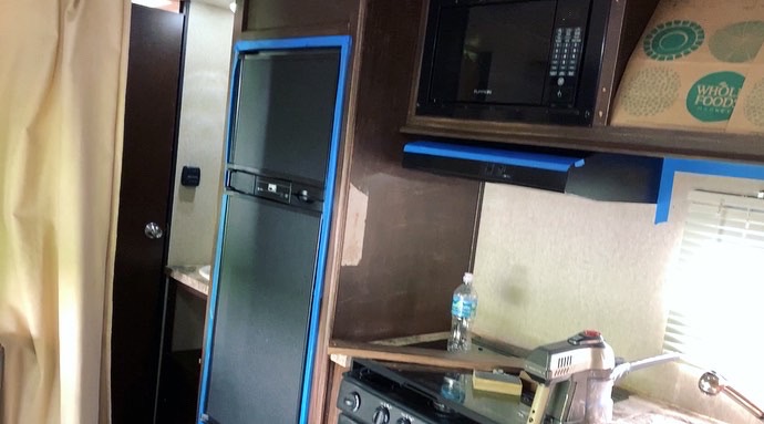 I started with removing all the cabinet doors as well as all the hardware and sanded everything down with 200 grit sandpaper. Most travel trailers are made the same; particle board and contact paper over it to give it the real wood look. They do that mainly so it is nice and light and most SUV’s or minivans can tow it. It is key too sand and prime all of the contact paper really well or the paint will not stick.