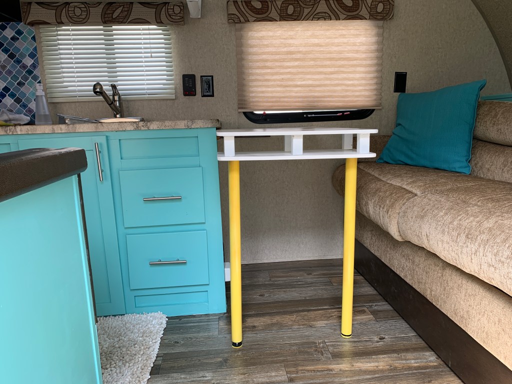 We decided to give our travel trailer a facelift. So we start by repainting the inside of our RV to the colors we love! We added some peel and stick tile in the kitchen area and added and additional workspace to make working on the road much easier. We have a lot more work to do, but this is a great start.